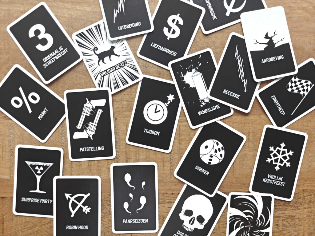 Zodra een zwarte kaart wordt gespeeld op basis van hetzelfde getal, draai je een gebeurteniskaart om. Dit kan van alles zijn: kaarten doorgeven, een kijkje in elkaars kaarten of zelfs direct een nieuwe ronde beginnen.