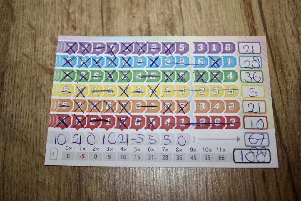 - De verticale rijen leveren ook punten op, dus hoe meer verschillende kleuren hetzelfde getal aankruisen, hoe meer punten het oplevert.